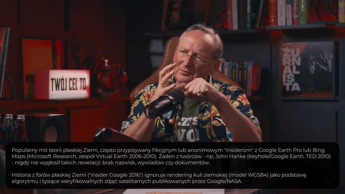 "Popularny mit teorii płaskiej Ziemi, często przypisywany fikcyjnym lub anonimowym "insiderom" z Google Earth Pro lub Bing Maps (Microsoft Research, zespół Virtual Earth 2006-2010). Żaden z twórców - np. John Hanke (Keyhole/Google Earth, TED 2010) - nigdy nie wygłosił takich rewelacji: brak naziwsk, wywiadów czy dokumentów. Historia z forów płaskiej ziemi ("insider Google 2016") ignoruje rendering kuli ziemskiej (model WGS84) jako podstawę algorytmu i tysiące weryfikowalnych zdjęć satelitarnych publikowanych przez Google/NASA" - napisano.
