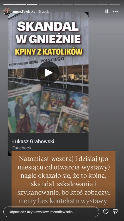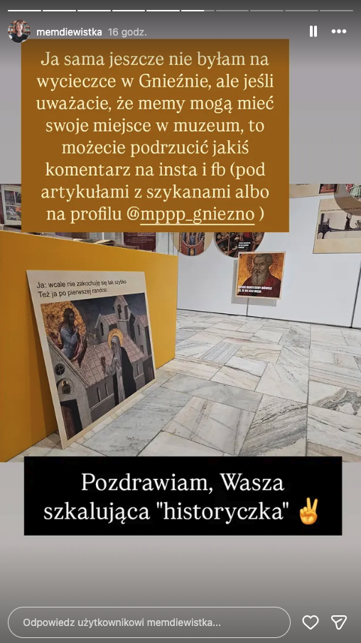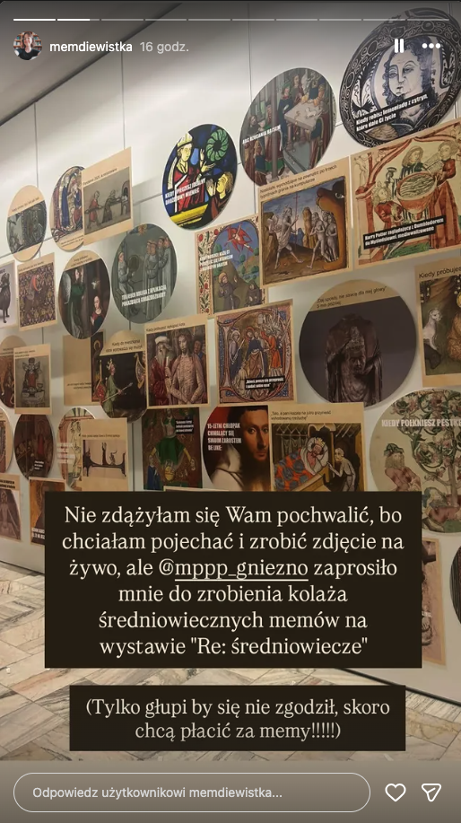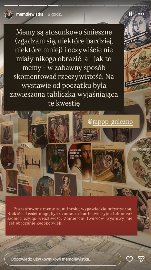 "W związku z pojawiającymi się negatywnymi opiniami dotyczącymi instalacji memów na wystawie czasowej "Re: średniowiecze. 1000 lat, 1000 wersji" wyjaśniamy, że wystawa ma na celu ukazanie i badanie recepcji średniowiecza na przestrzeni epok, od renesansu aż do czasów nam współczesnych. Stanowiąca jeden z jej elementów, instalacja artystyczna autorstwa Zofii Załęskiej, historyczki sztuki i badaczki ikonografii średniowiecza, dotyka zagadnienia, jak współczesny język komunikacji - memy - rezonuje z estetyką epoki.