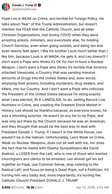 Wpis prezydenta Trumpa to reakcja między innymi na szereg wypowiedzi papieża, w których wzywał on do zakończenia wojny w Iranie. Mówił też, że Bóg nie słucha modlitw w intencji wojny, jednak Biały Dom był innego zdania:
