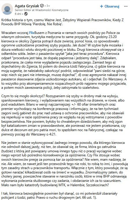"Nie jestem w stanie wykoncypować żadnego innego powodu, dla którego kierowca nie odmówił dalszej jazdy, niż ten, że obawiał się, że firma, która go zatrudnia (tudzież z którą jest powiązany umową innego typu niż o pracę) wyciągnie wobec niego wprost lub pośrednio konsekwencje za opóźnienie.