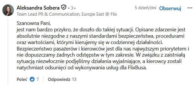 Co istotne już dzień po publikacji posta przez kobietę, do sprawy odniosła się