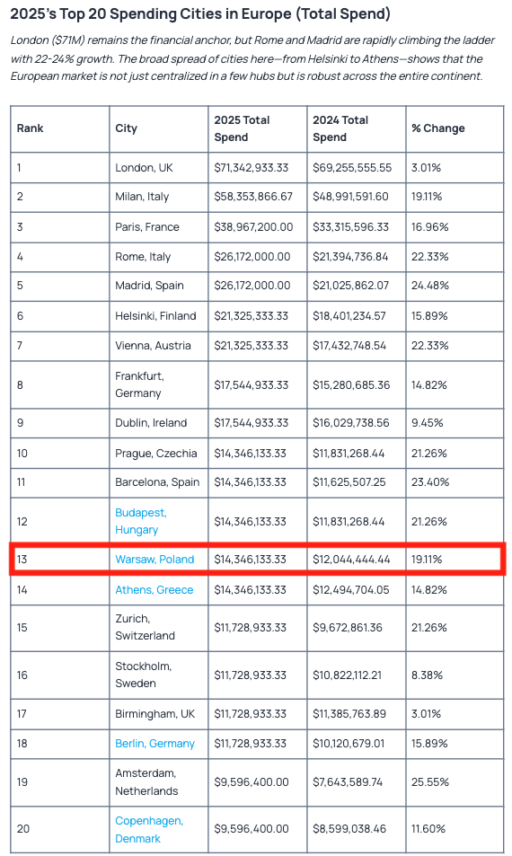 (wzrost rok do roku o 19%) znajduje się na 13. miejscu rankingu miast Europy oraz na 41. miejscu rankingu miast świata. W przeliczeniu na 10 tys. mieszkańców warszawiacy wydali na OnlyFans prawie 80 tys. dolarów, co daje jej 57. miejsce na świecie. Liderami tego rankingu są Atlanta, Orlando, Mediolan, Miami oraz Helsinki. Pod względem całkowitych wydatków dominują największe metropolie, takie jak Nowy Jork, Los Angeles i Londyn, chociaż dynamicznie rosną również miasta Ameryki Łacińskiej oraz regionów rozwijających się.