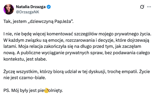 "Tak, jestem "dziewczyną PapJeża". I nie, nie będę więcej komentować szczegółów mojego prywatnego życia. W każdym związku są emocje, rozczarowania i decyzje, które dojrzewają latami.