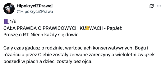 "Zdradziliście nie tylko wartości które podobno są dla was tak ważne ale i jej partnera. Od miesięcy udajecie, że nic się nie dzieje a żyjecie w kłamstwie, grzechu i sku*wysyństwie. Jesteście małymi ludźmi".