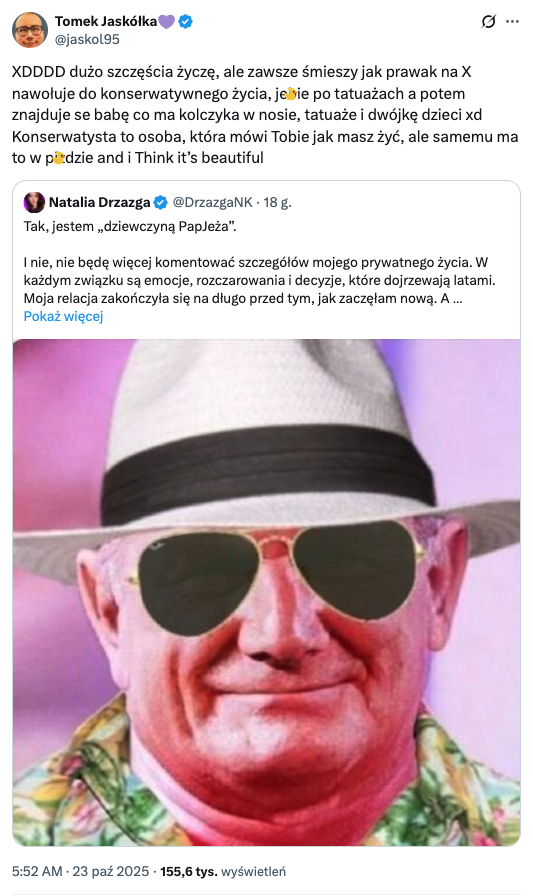 PapJeż p0lak to prawicowy komentator, który zyskał ogromną rozpoznawalność na Twitterze, krytykując współczesne trendy, politykę i znanych ludzi. Ma