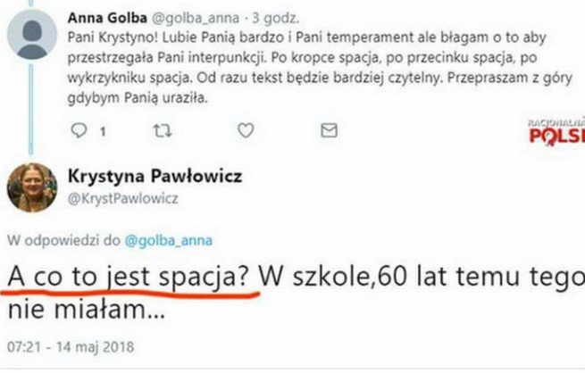 Pod jednym z wpisów, w którym posłanka Pawłowicz wykazała się swobodą w traktowaniu zasad języka polskiego, internautka deklarująca się jako zwolenniczka posłanki