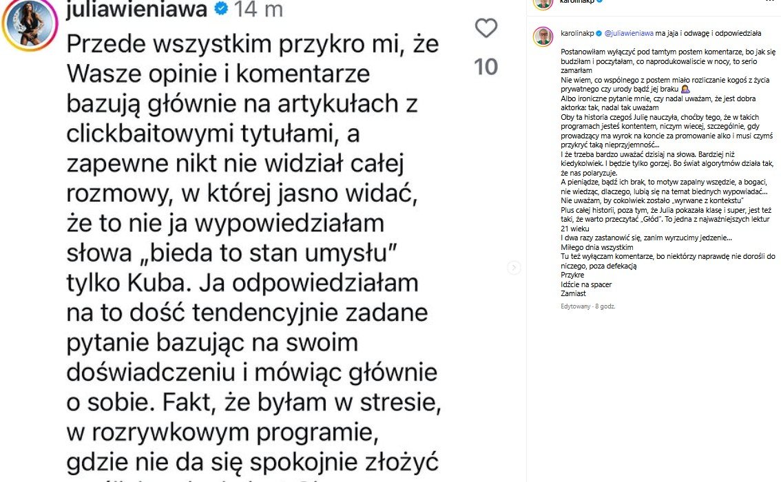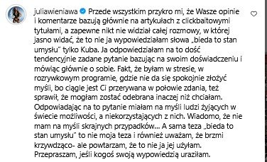 "Przede wszystkim przykro mi, że Wasze opinie i komentarze bazują głównie na artykułach z clickbaitowymi tytułami, a zapewne nikt nie widział całej rozmowy, w której jasno widać, że to nie ja wypowiedziałam słowa »bieda to stan umysłu« tylko Kuba.