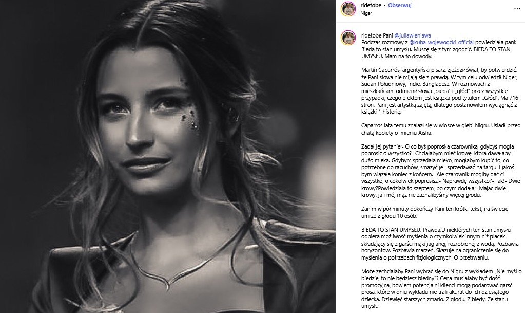 "Pieniądze, bądź ich brak, to motyw zapalny wszędzie, a bogaci, nie wiedząc, dlaczego, lubią się na temat biednych wypowiadać... Nie uważam, by cokolwiek zostało »wyrwane z kontekstu«. Plus całej historii, poza tym, że Julia pokazała klasę i super, jest też taki, że warto przeczytać »Głód«. To jedna z najważniejszych lektur 21 wieku. I dwa razy zastanowić się, zanim wyrzucimy jedzenie…" - dodała.
