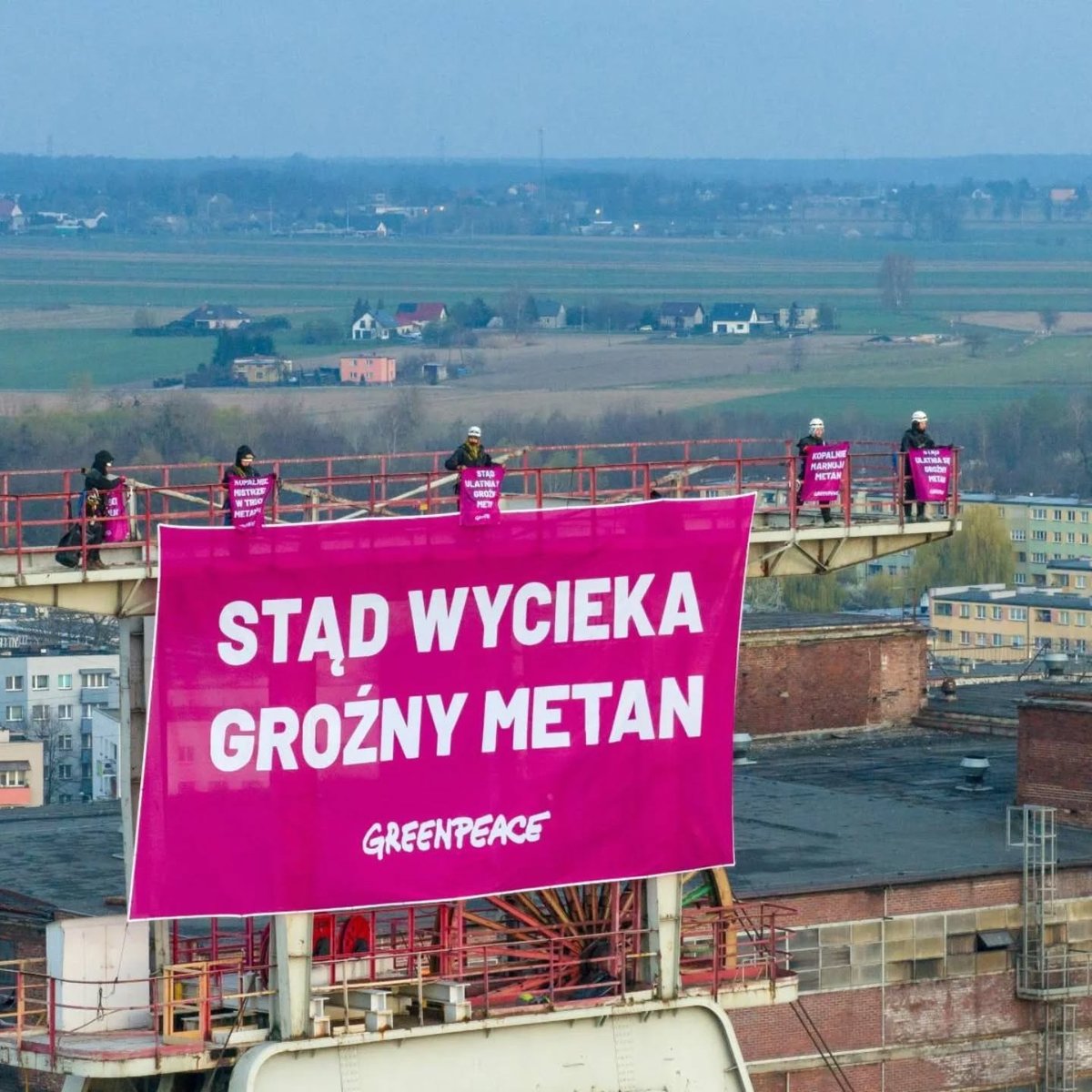 wspięła się na wieżę kopalni Szczygłowice w województwie śląskim i rozwiesiła na niej transparent o treści "